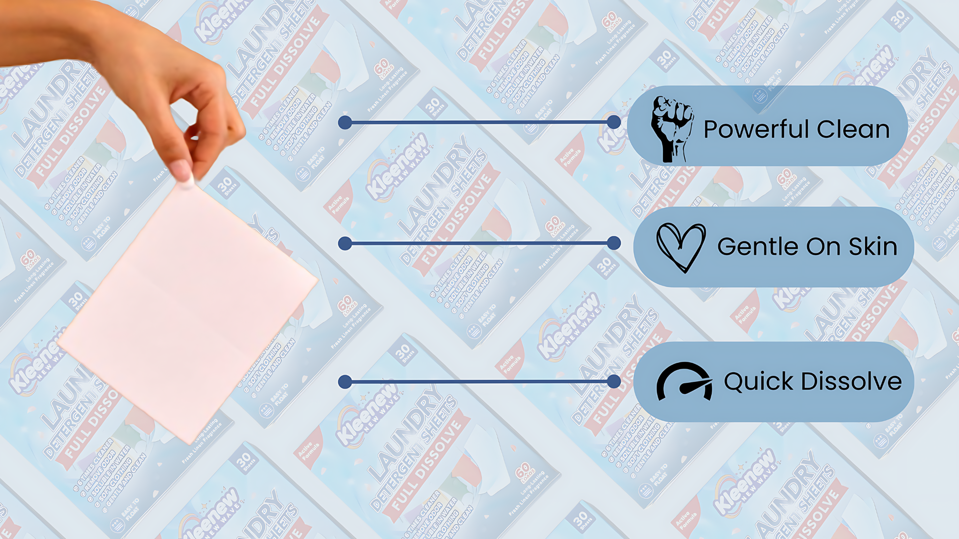 Our biodegradable detergent sheets are a game-changer for the environment. By choosing Kleenew, you are significantly reducing plastic waste compared to traditional liquid and powder detergents. Each sheet is designed to dissolve completely, leaving no harmful residues behind, making your laundry routine greener and more sustainable.